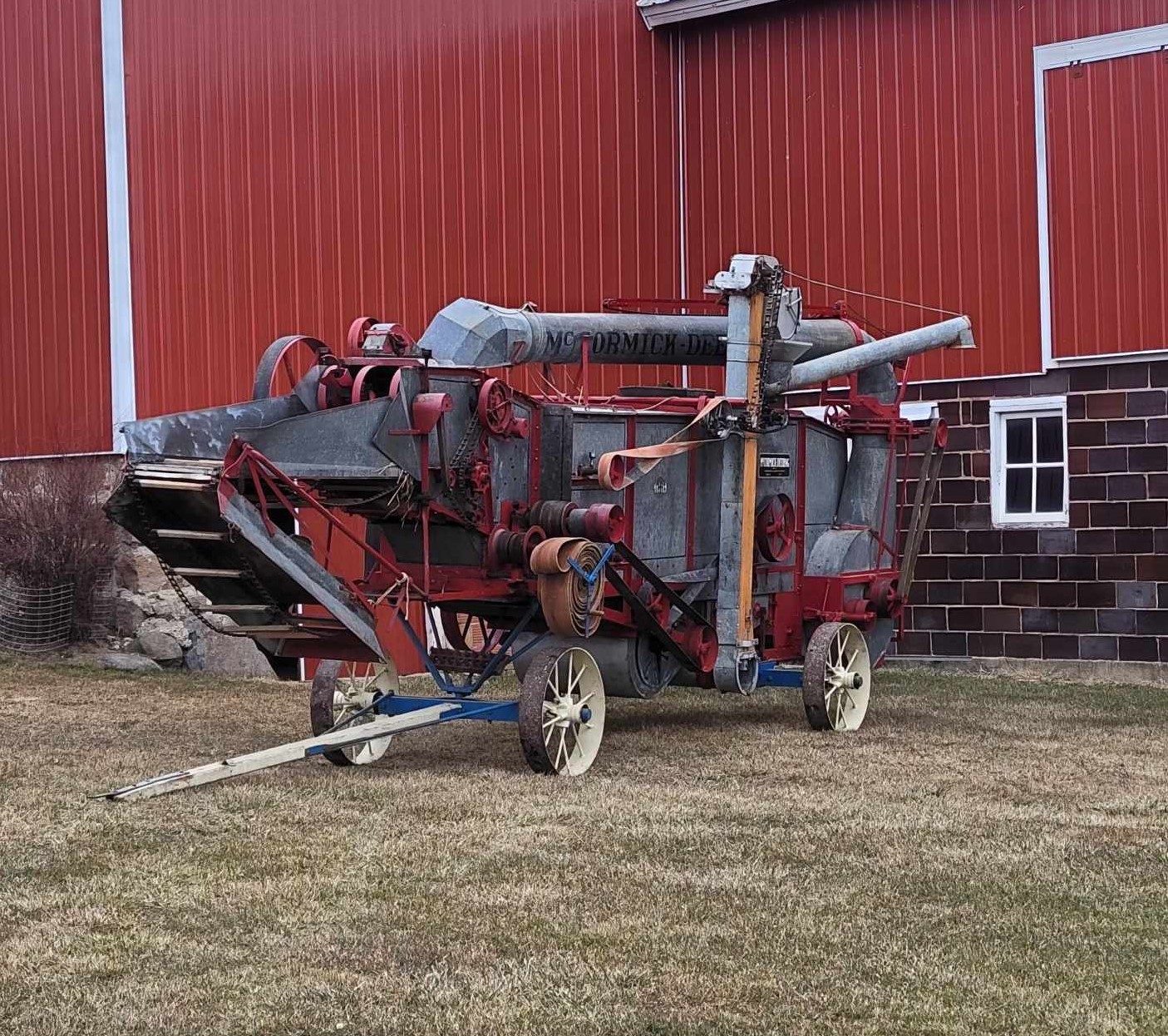 Gene Niewoehner posted McCormick Deering thresher. Manufactured in 1927 and was used until about 1957 when it was retired and left outside. 1927 was the first year the all steel was made I believe. The early feeder on it was a slightly different design than was used in later years. I put a long conveyor from a later machine on it. It is equipped with babbit bearings (except for the cylinder and blower) and grease cups. It runs very quiet. The hart elevator has wooden sides. In 1987 it was adopted by me repaired and restored. Spent the next 35 years demonstrating here on the farm and then at our antique equipment show. It again needed an overhaul in 2023 (not as extensive) and I finished it this last week. It also received four new belts and other overdue repairs. It should be ready for the next 30 years. I suspect they will be more restful years than work. I set it by the barn, where I used to demonstrate it, for this photo opportunity.😉This will be my last thresher overhaul, as I have done five of them. I am keeping this one. 22 X 38 |